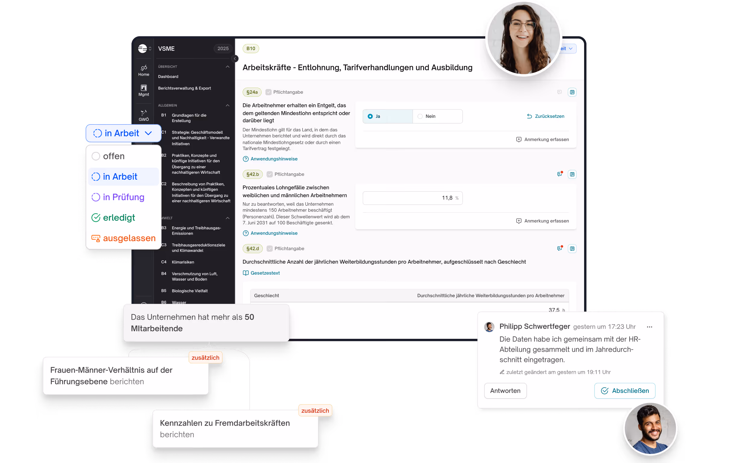 Direkt an den relevanten Stellen im Bericht kommentieren, Aufgaben an Kolleg:innen vergeben und zeitversetzt weiterarbeiten – goodbalancer macht den VSME-Prozess zur echten Gemeinschaftsaufgabe, ohne dass dabei der Überblick verloren geht.